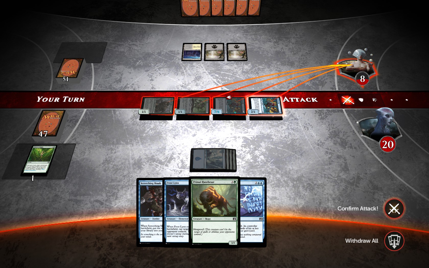 Once the connection issues were out of the way, the game worked very well. Menu items are highlighted to direct you to where you should go next to learn your way around, and the first story campaign introduces the basic concepts, spell types, and abilities as you go along. I had seen someone claim (I don't recall where now) that the concept of the stack wasn't included in this game, and that there were no instants.  I'm happy to report that that is not the case; I have to assume that they just didn't play far enough in for instants to be introduced. Most of the decks I tried out in AI duels were green / something and the pleasure of turning a 2/1 weenie into a 7/6 trampler is alive and well.